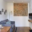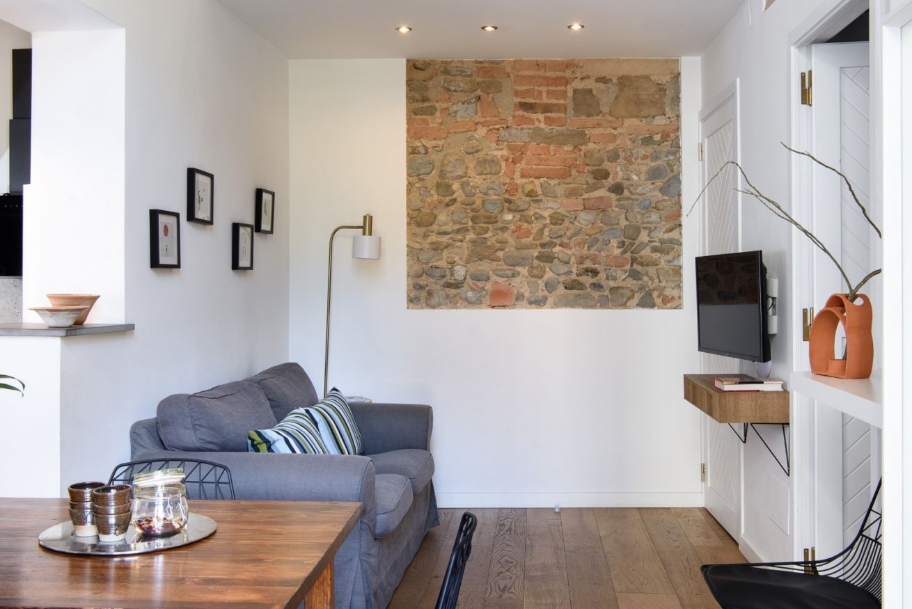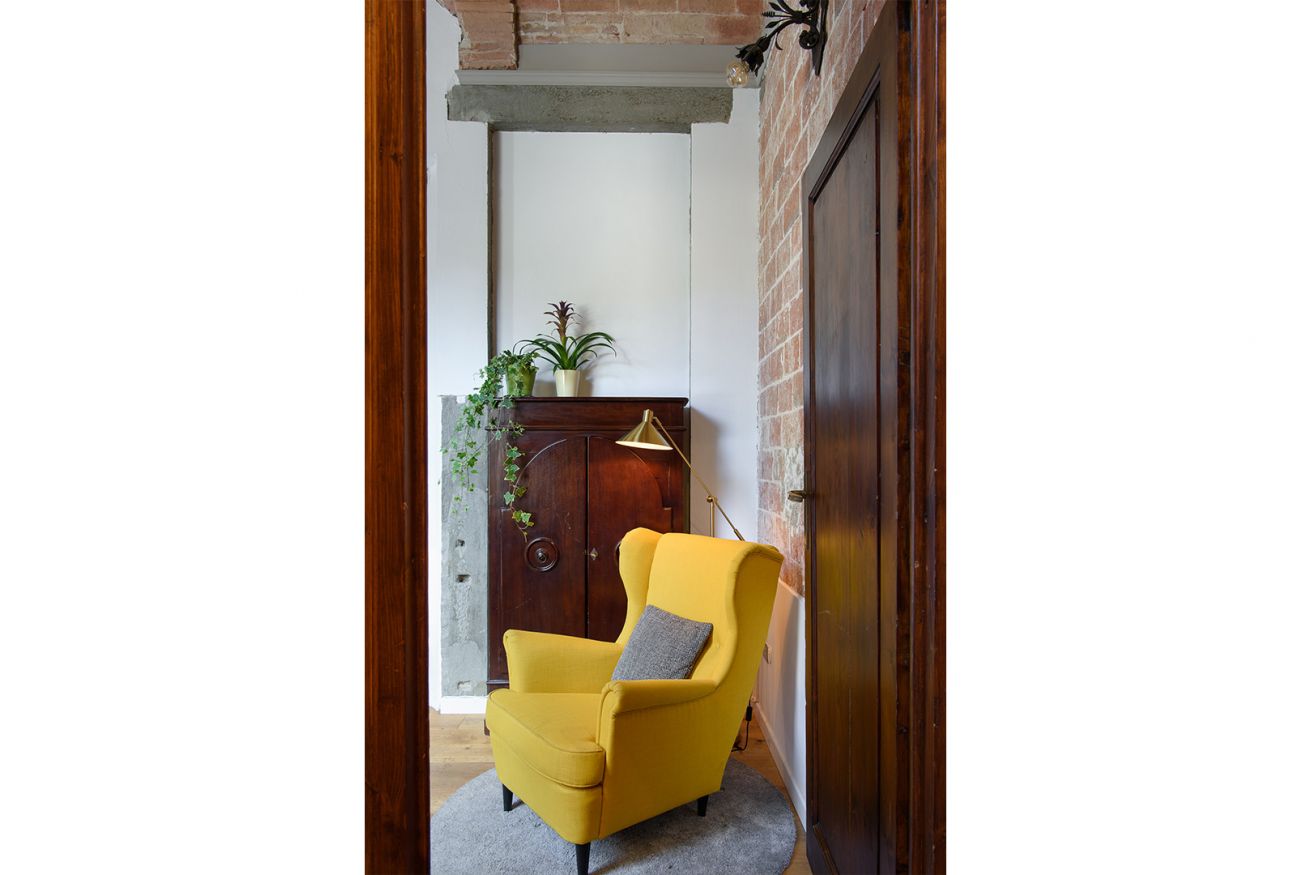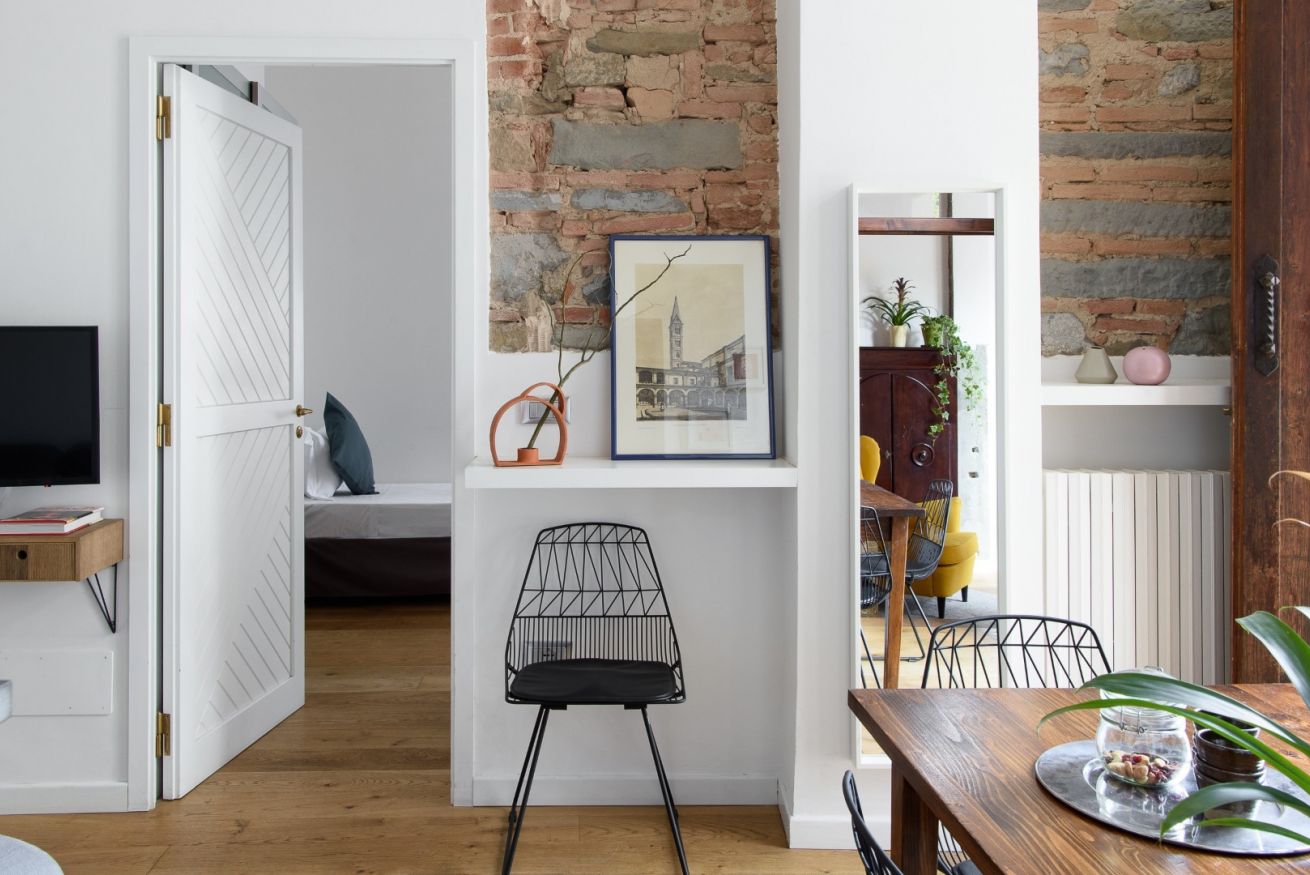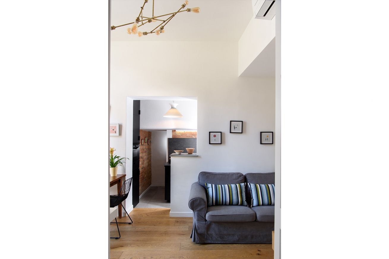 The carefully designed interiors welcome you with a combination of warm-colored walls and parquet floors. The walls feature alternating river stone, exposed brick, and even an ancient arch that marked the end of the 17th-century part of the building; most likely, there was once a portico here that led to the palace.