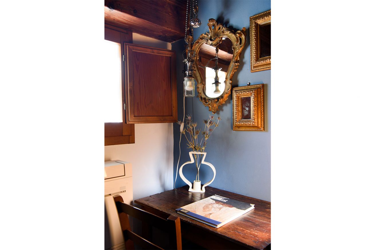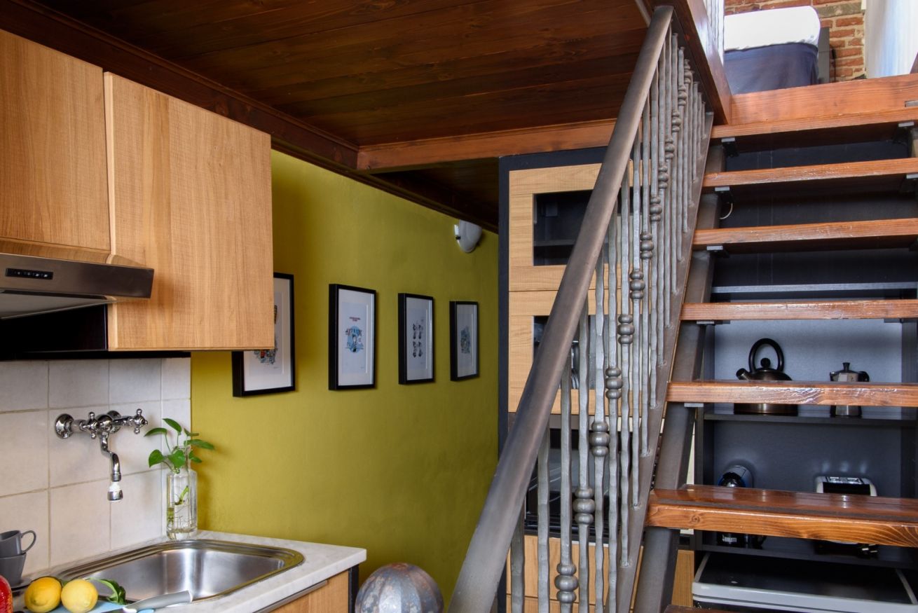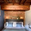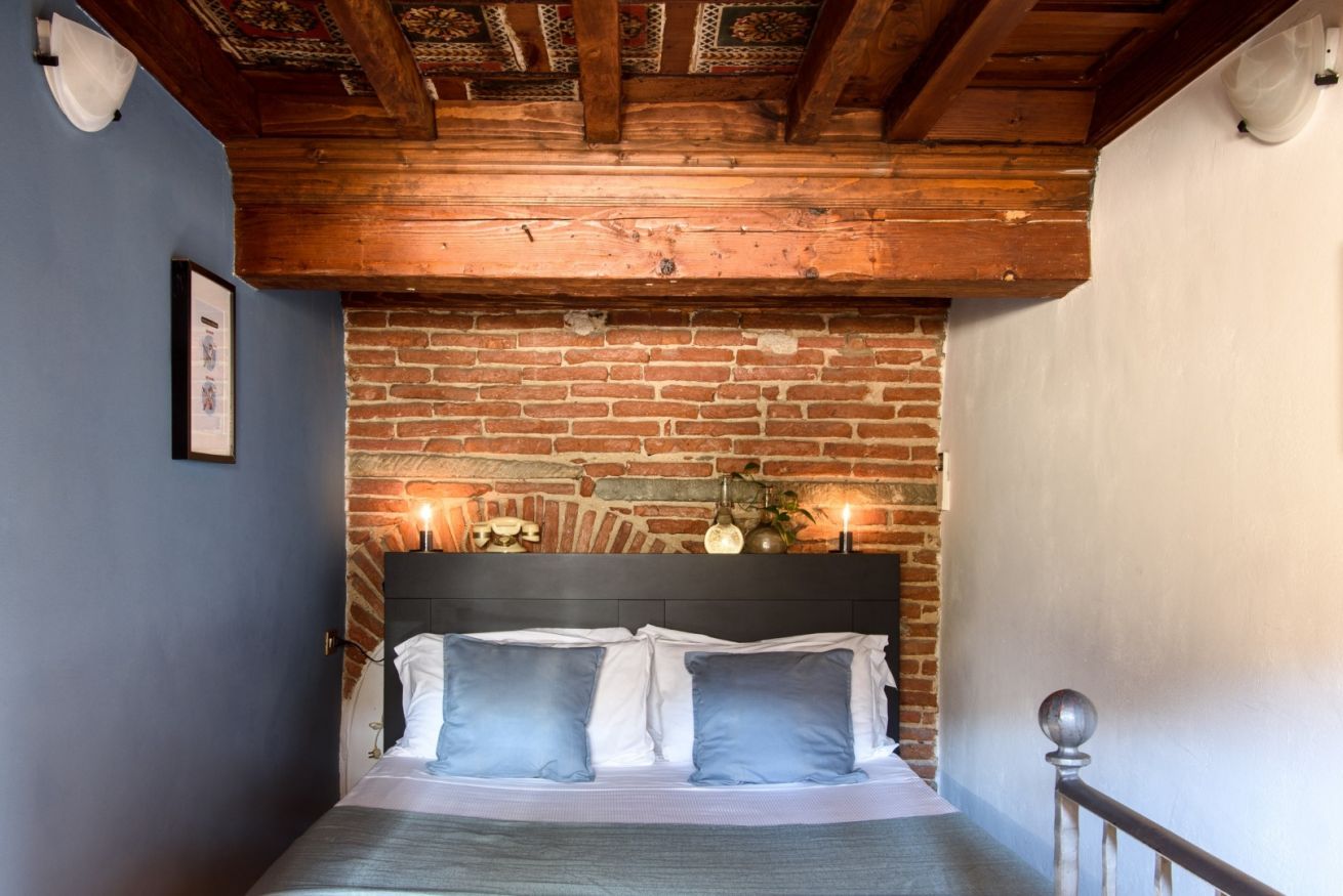 The bedroom, with its painted wooden ceilings, evokes the 16th-century past of this part of the building. The warm tones and colors of the walls fill the rooms with romance. The rooms are on two levels, with the living area and bathroom on the ground floor and the bedroom in the loft.