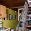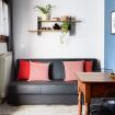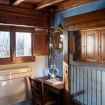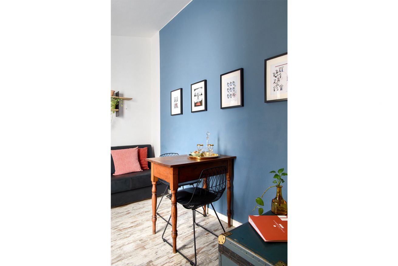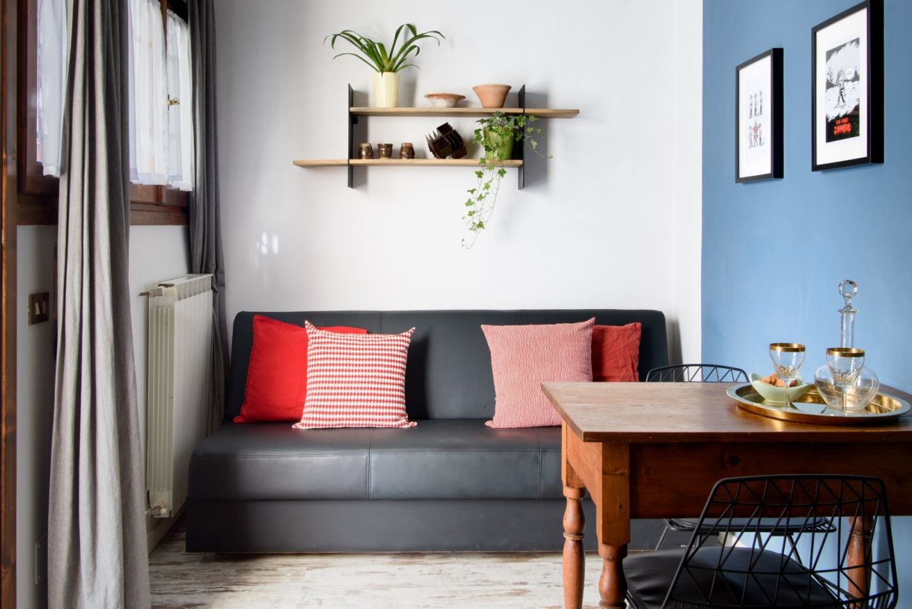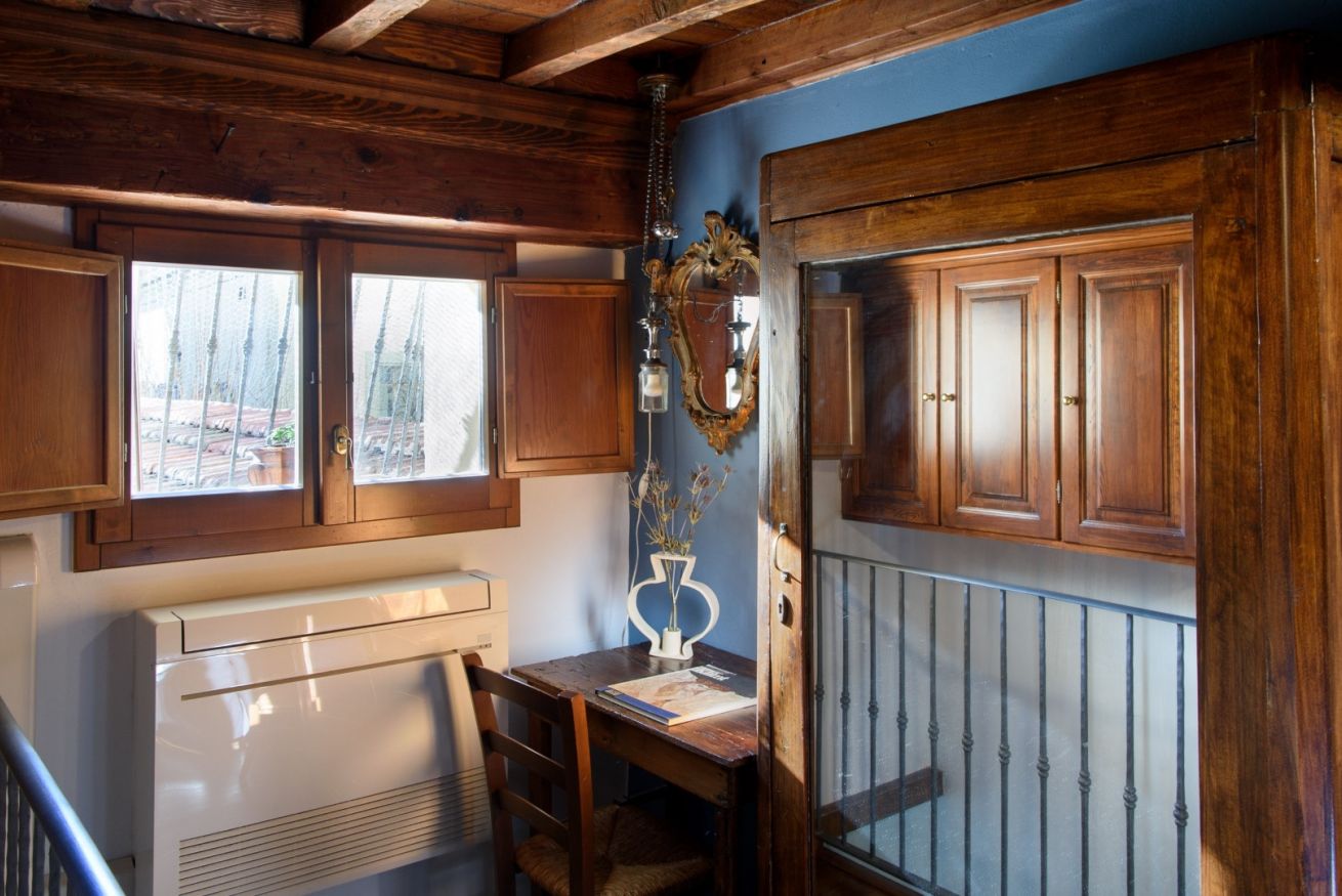 The bedroom, with its painted wooden ceilings, evokes the 16th-century past of this part of the building. The warm tones and colors of the walls fill the rooms with romance. The rooms are on two levels, with the living area and bathroom on the ground floor and the bedroom in the loft.