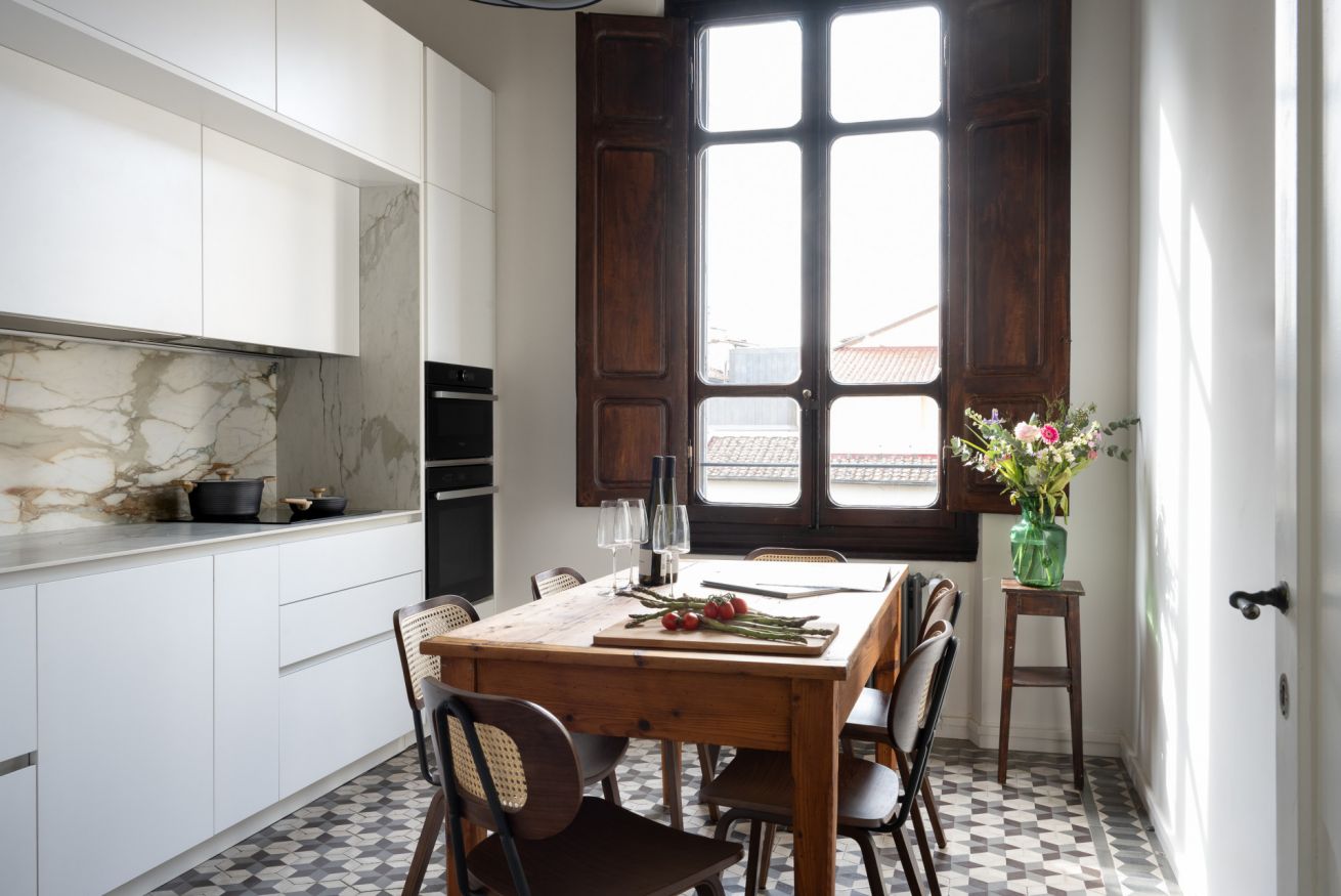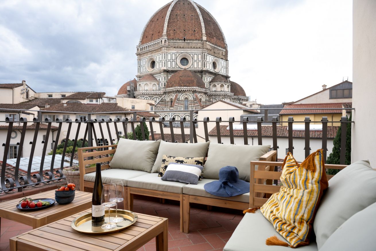 The common areas include a cozy living room, a kitchenette (equipped with a refrigerator, microwave, and coffee machine), a laundry room, and, above all, a magnificent terrace with a unique view of the Duomo, furnished with sofas and tables, perfect for relaxing or enjoying an aperitif at sunset.