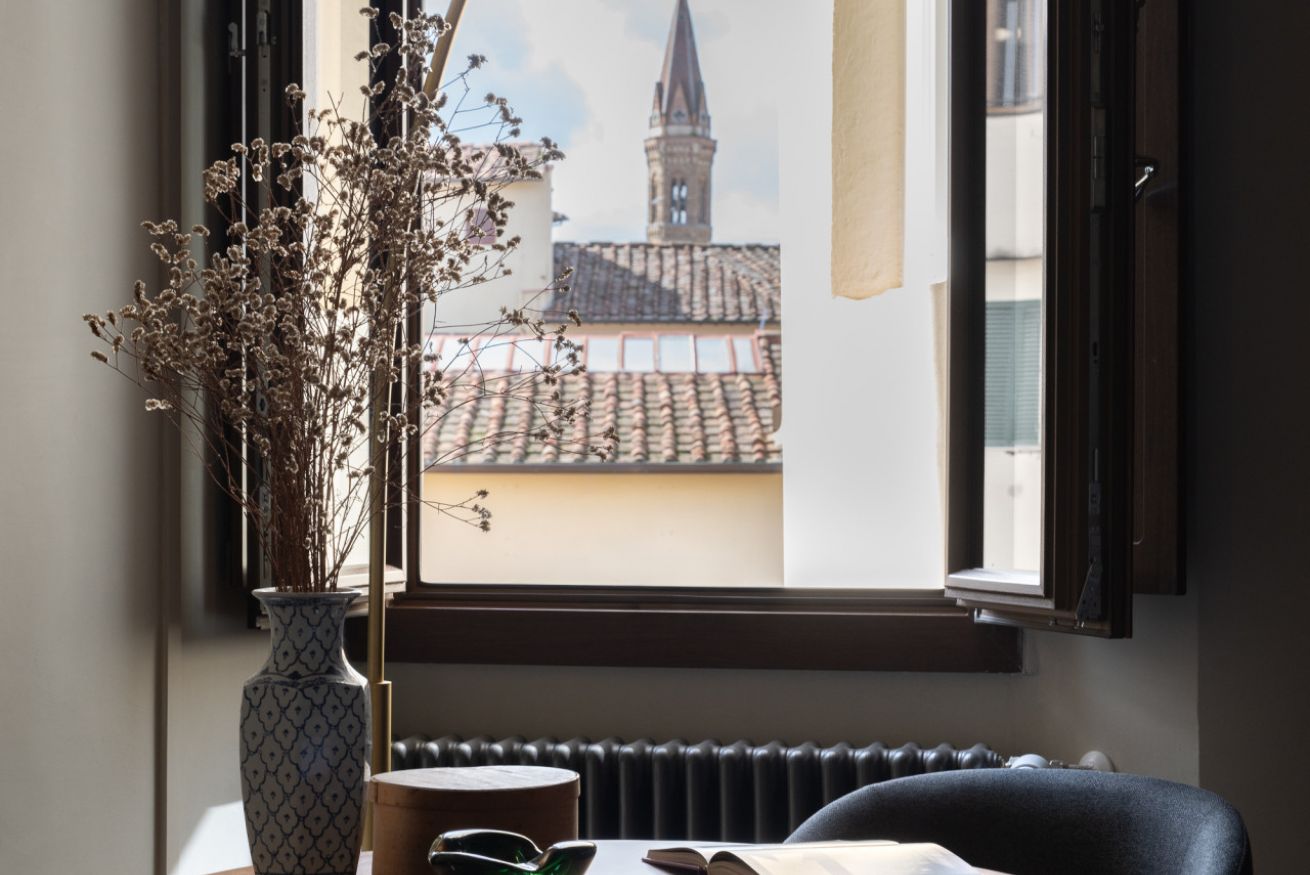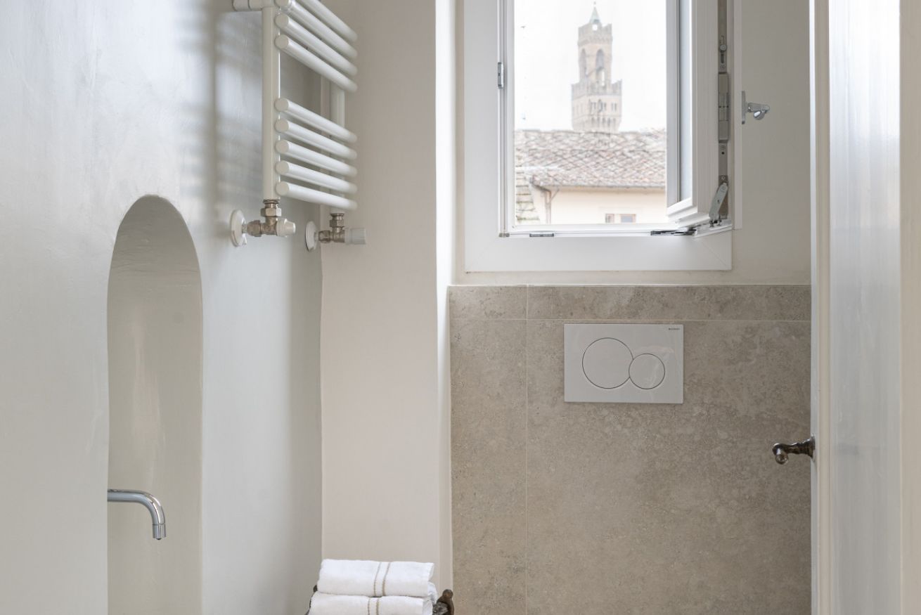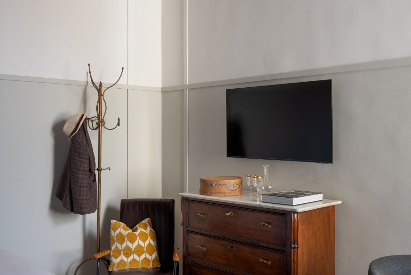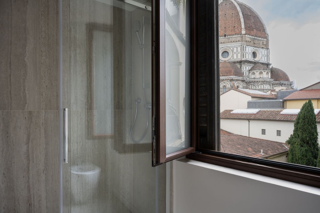 The Standard Suite is an intimate and cozy double room with a private external bathroom, furnished in a simple but refined style, designed to offer comfort and functionality in the heart of Florence.