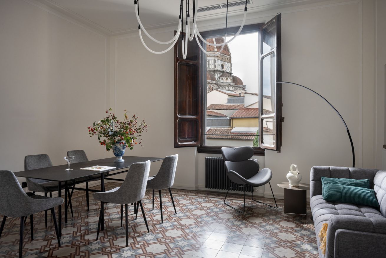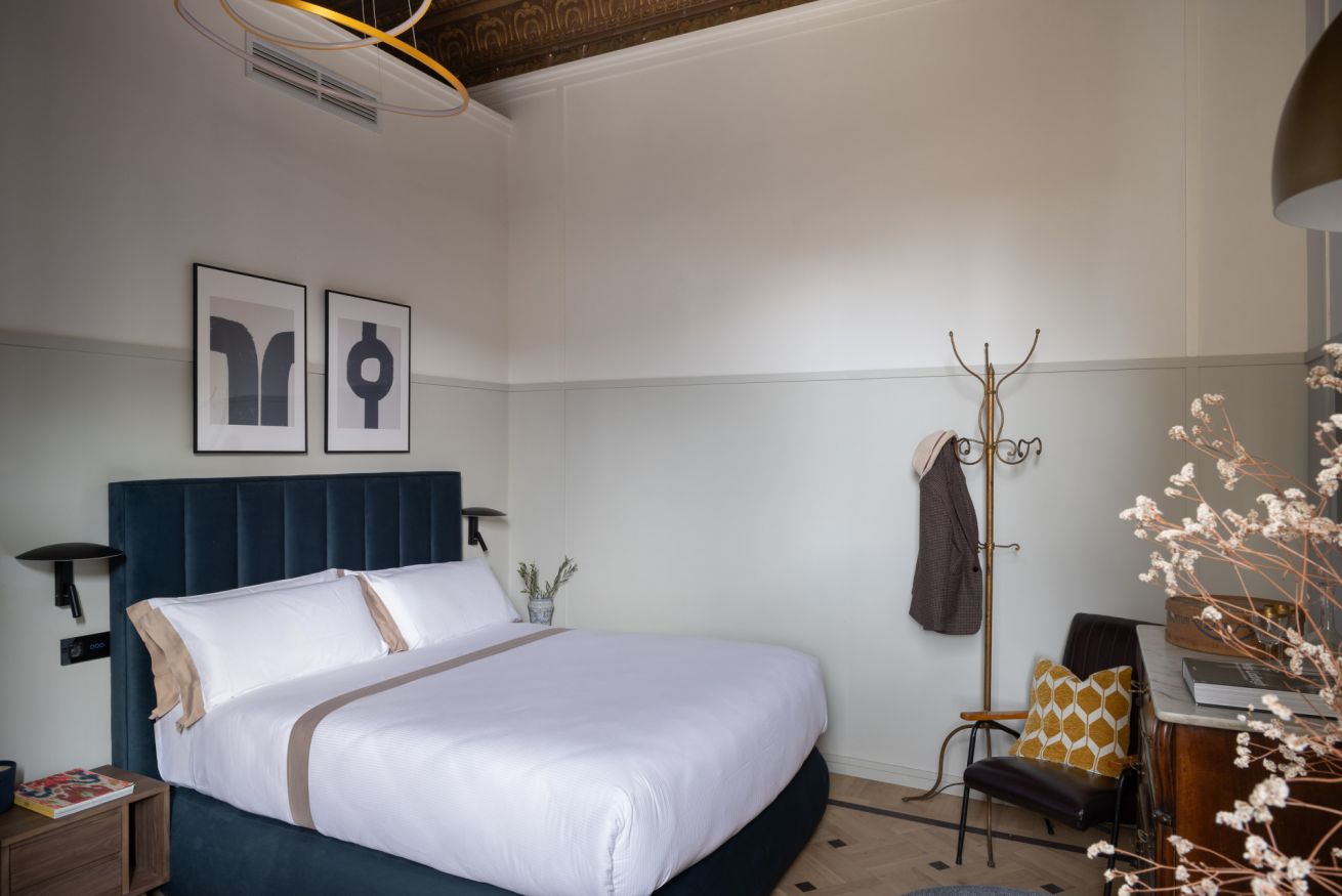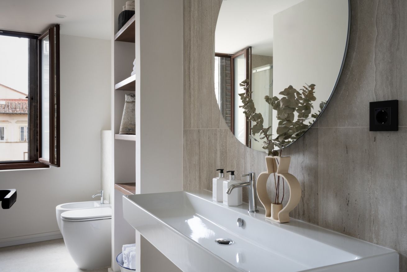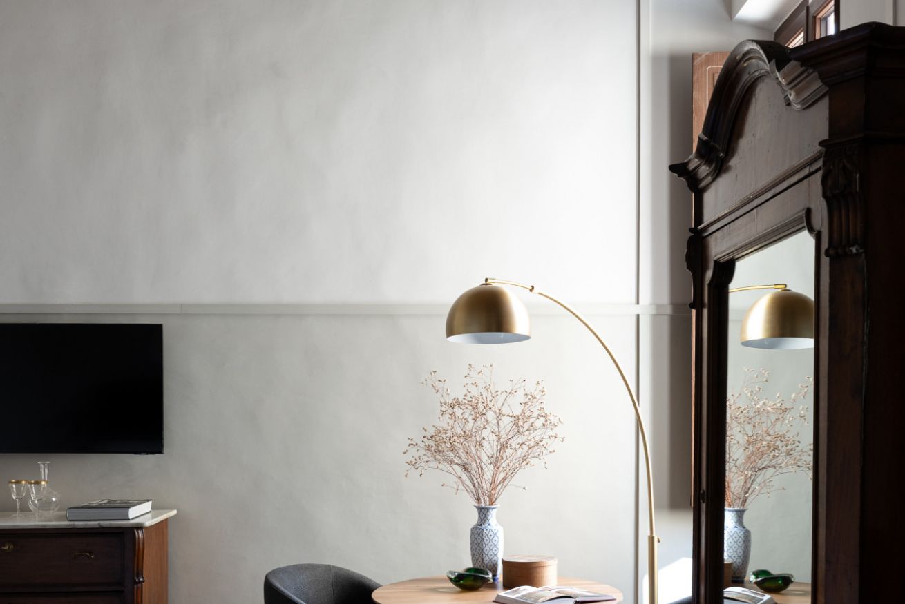 The Standard Suite is an intimate and cozy double room with a private external bathroom, furnished in a simple but refined style, designed to offer comfort and functionality in the heart of Florence.